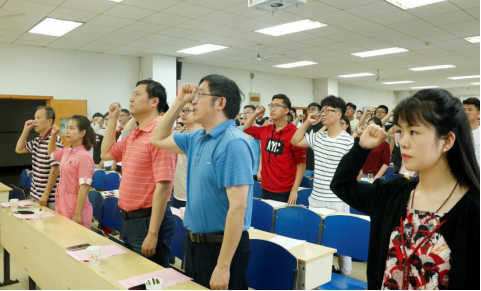 在张桐老师布置教学安排及学习要求后,全体成员在梁叔全教授领誓下宣读入党誓词。大家握紧拳头,目光如炬,声音洪亮,以此来表明自己为实现中华民族伟大复兴而努力,为共产主义奋斗终身的决心。至此,本次培训班开班典礼接近尾声。