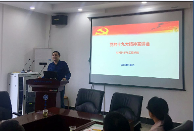 王德志书记在会上详细讲解了十九大报告的主要内容,从过去五年的工作和历史性变革、新时代中国共产党的历史使命、新时代中国特色社会主义思想和基本方略等十三个方面向参会师生对习近平总书记十九大报告主要精神进行了解读,并对十九大提出的“40个新提法新举措”、“10大关键词”进行了总结梳理。王德志书记指出,党的十九大作出的最重要的决定,就是把习近平新时代中国特色社会主义思想确立为党必须长期坚持的指导思想。新时代肩负新使命,新使命开启新征程,习近平总书记在党的十九大报告中,开宗明义地昭告了这次大会的主题:“不忘初心,牢记使命,高举中国特色社会主义伟大旗帜,决胜全面建成小康社会,夺取新时代中国特色社会主义伟大胜利,为实现中华民族伟大复兴的中国梦不懈奋斗。”这一主题,鲜明地向世人宣示了我们党在新时代举什么旗、走什么路、以什么样的精神状态、担负什么样的历史使命、实现什么样的奋斗目标继续前进的重大问题,是向全党全国各族人民吹响的前进号角。学习、宣传、贯彻、落实十九大精神是接下来一个时期全党最重要的政治任务,我们要高举新时代中国特色社会主义伟大旗帜,不断努力提高党性修养,要勤学、好学、善学,在不同的岗位上为党的事业努力奋斗。王德志书记强调,在公司推进“双一流”建设的关键阶段,我们要以十九大精神为指导,不忘初心、牢记使命、全面谋划、全员共建、细分精做、努力推进,发扬学科优势,踏实创新,加快材料学科发展,提高国际影响力,为实现中华民族的伟大复兴做出贡献。