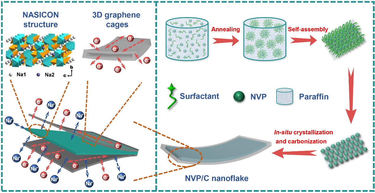 为了解决上述重要技术难题,公司研究团队通过熔融烃辅助固相反应法成功构筑了一种三维石墨烯笼子,将Na3V2(PO4)3纳米片裹覆其中,构筑出一种特殊纳米阵列材料,设计方案具有简单、环保、有效等特点,而且可以作为一种的普适方法,拓展至其他电极材料的电化学性能改善,有望发展成具有快速充放和长循环寿命储能电池新技术。