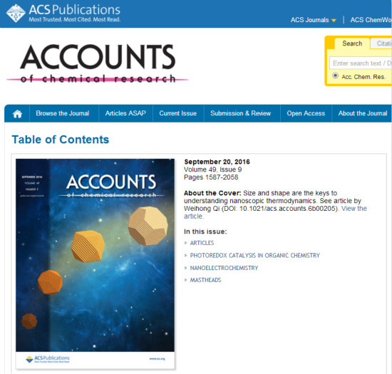 近日获悉:公司齐卫宏教授撰写的“Nanoscopic Thermodynamics”特邀综述论文,在美国化学学会(ACS)的顶级期刊《Accounts of Chemical Research》(IF:22.003)上以期刊封面论文刊出。