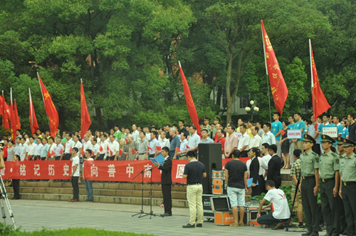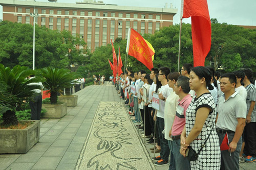 当国歌奏响时,全体师生高声唱响激励中国军民英勇抗日十四年的《义勇军进行曲》,饱蘸烈士鲜血的五星红旗伴随着国歌声冉冉升起,胜利者的自豪与骄傲跃然于每一位师生的脸上。随后,员工代表在国旗下庄严宣誓“勿忘国耻,铭记历史,向善中南,圆梦中华”。公司13级员工蔡康宁同学在国旗下满含深情地说:一个不忘国耻而愤然前行、始终居安思危的民族,才是一个伟大的民族。我们当代青年老员工要永远铭记惨遭日本侵略者杀戮的无辜死难同胞,我们要永远铭记这段历史,因为它的悲壮惨烈与不屈抗争应该成为民族的集体记忆,我们更应该从中汲取启示智慧,获得开创未来的现实力量。