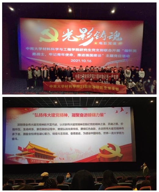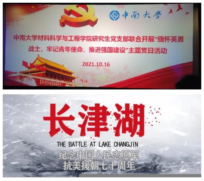 青山埋忠骨,山河念英魂。为庆祝中国共产党建党100周年,迎接纪念中国人民志愿军抗美援朝七十一周年,深入推进党史学习教育走深走实,进一步弘扬爱国主义精神,赓续红色血脉,10月16日晚上,伟德国际1946博士生第一、第二、第三党支部和19级材料学、20级材物化、材料学、材加、21级材物化、材料学、材加研究生党支部以及本科生第六党支部共11个党支部共计195名党员在院组织干事王利容老师的组织下,联合开展“缅怀英雄战士,牢记青年使命,推进强国建设”主题党日活动——集中观看电影《长津湖》。该片以抗美援朝战争中的长津湖战役为背景,再现了一段在极寒环境下,抗美援朝东线作战部队凭着钢铁意志和英勇无畏的战斗精神,扭转战场态势的历史,歌颂了为长津湖战役胜利作出重要贡献英烈们的英勇事迹。
