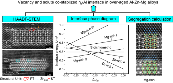 欧奕孜同学在伟德国际1946官网江勇教授和挪威科技大学Randi Holmestad教授的指导下,选择η相最常见的变体类型之一η1相作为突破口,运用第一性原理计算与高分辨电镜(HAADF-STEM)表征高度结合的研究方法,首次构建了η1/Al相界面相图,并进一步结合主元素的复杂界面偏析计算,预测和阐明了不同Zn含量下η1相界面结构及其形成机制。研究发现,不同于空位极少的亚稳η’相界面,η1相界面实为大量空位和溶质共同偏析作用下形成的一种复杂重构界面。空位与溶质的共偏析,极大提高了η1相在过时效状态下的稳定性,使其能够成为η相中数量最多的一种变体。计算印证和解释了高分辨电镜表征观察结果,同时从理论上支持了η1相可能无需借助任何过渡相,从过饱和固溶体中直接析出的这一假设,为科学调控η相中不同变体的相对比例提供新的认知和思路。
