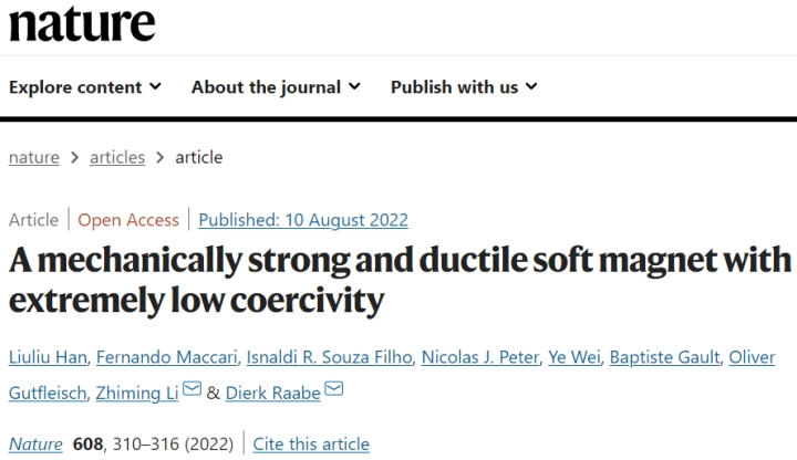 公司李志明团队与国际合作者在Nature上发表论文:研发具有高强度、高延展性、极低矫顽力的多组元软磁合金