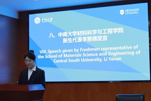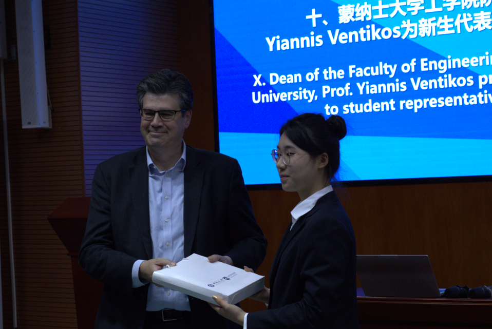 最后,蒙纳士大学工公司经理Yiannis Ventikos为新生代表赠送礼物。国际合作与交流处副处长陈强勉励2023级新生在未来学习中要不断开阔视野、提高能力,努力成为优秀的工程师、科研人员以及行业杰出人才。