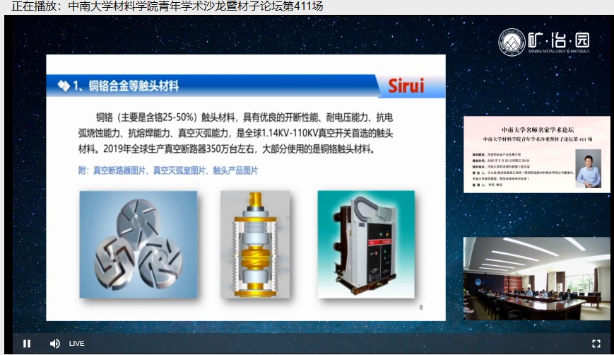 2020年5月20日上午9:00,伟德国际1946官网伟德国际1946青年科协联合伟德国际1946官网伟德国际1946研究生会举办的青年学术沙龙第411场学术讲座于特冶楼229成功举办。陕西斯瑞新材料股份有限公司董事长王文斌一行,伟德国际1946的李周教授等老师出席讲座,受疫情影响,伟德国际1946共130余名员工通过矿冶园网站进行线上听讲。