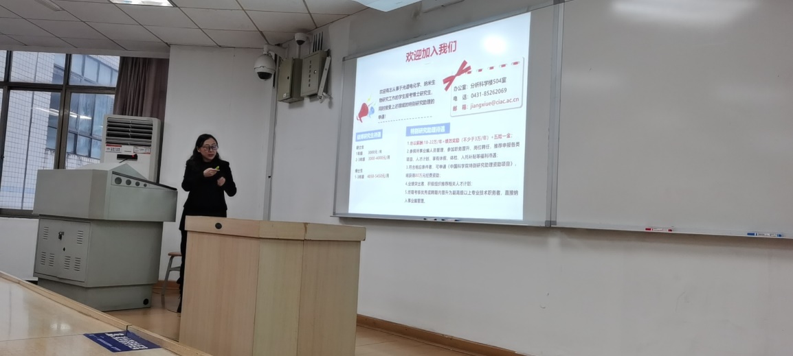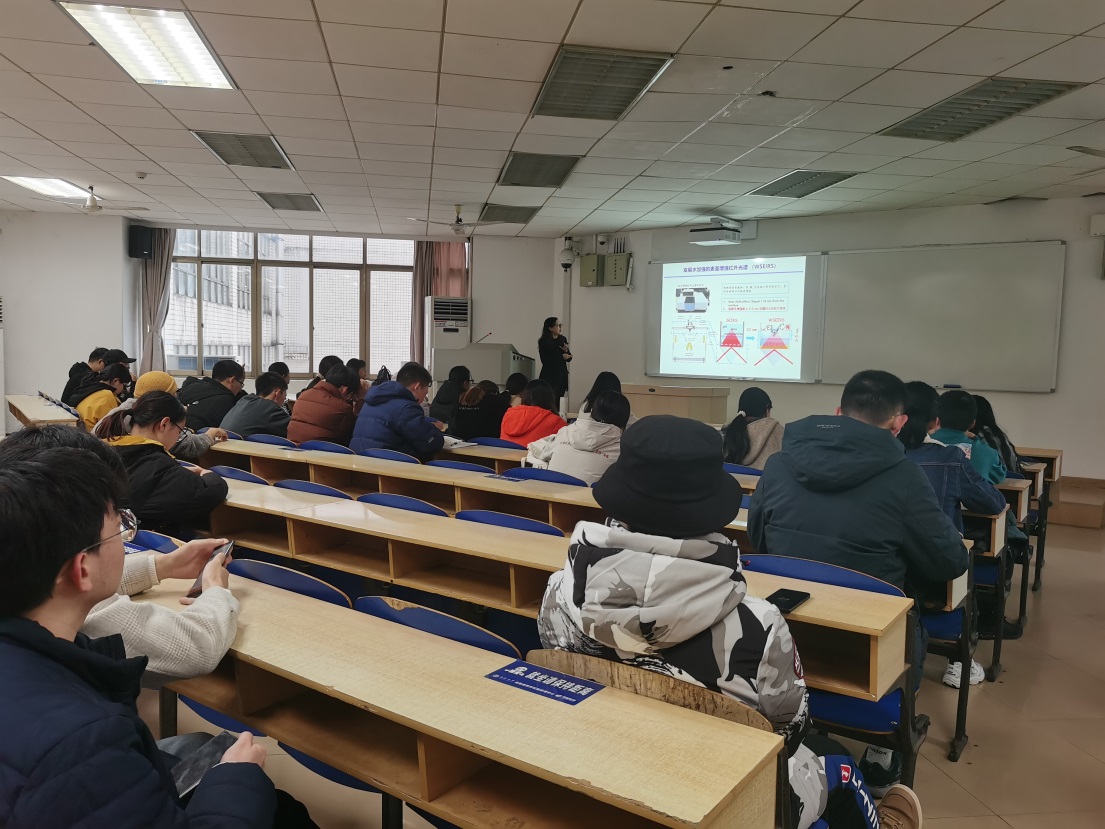 姜秀娥研究员以“谱学电化学和成像分析——你所向往的研究生生活”为题展开了精彩的学术汇报。在本次报告中,姜秀娥研究员介绍了纳米技术在生物医学方面的发展。详细讲解了纳米材料在特定微环境的刺激下与癌细胞之间的基本相互作用,这对于传递纳米材料到肿瘤细胞并有效调控细胞活性具有极其重要的意义。我们将表面增强红外吸收光谱与荧光共聚焦成像方法结合,基于自下而上的模型体系及自上而下的活细胞体系系统研究了纳米尺度细胞作用的驱动力及胞内氧化还原反应,为构建新的肿瘤治疗策略提供了指导。