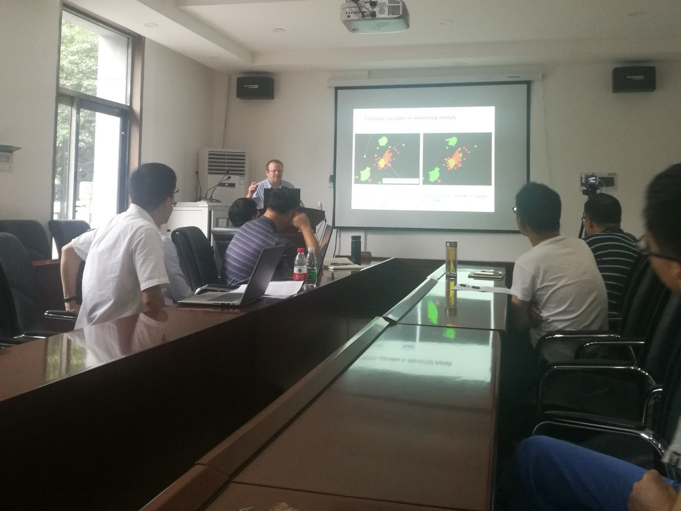 本次报告会题目为“固体中碰撞级联与结构缺陷的相互作用:分子动力研究”;报告会伊始,Roman博士首先简要介绍了碰撞与固体结构缺陷之间发生的联系。提出一种在碰撞级联中的模拟方案。在碰撞级联的初始阶段,通过将集合分解成“热”和“冷”原子的两个子集来加速。解释了真实材料的微观结构包括晶界、孪晶、叠层断裂、位错和其他影响导致材料应用性能的结构不均匀性,如辐射电阻。提出对现有或新开发的材料的耐辐射能力可以通过缺陷子系统的方向调整来改善。另一方面,利用离子束辐射纳米结构和表面技术提高了各种结构材料、功能材料和生物相容材料大范围的应用性能。报告结束后,Roman教授与在场师生进行了热烈的交流,细心回答了员工与老师提出的问题,现场气氛十分热烈。