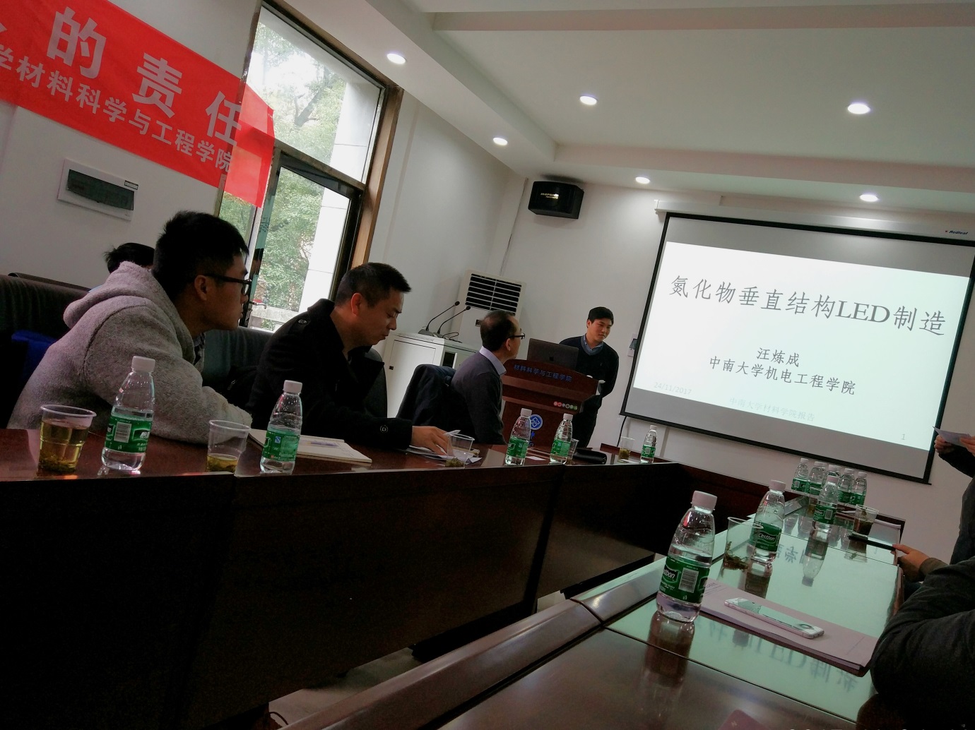 报告会题目为“氮化物垂直结构LED器件制造,半极性氮化物MOCVD生长”,汪炼成教授从氮化物LED研究背景、氮化物LED制造及等离子激元色彩打印展开论述。首先介绍了GaN的基本性质,第三代Ga半导体:信息化社会的基石,以及垂直结构LED相比传统的LED在光、热、电等方面具有的优势;从氮化物的研究背景引入垂直结构氮化物LED的制造工艺技术,包括金属接触、电流扩展、腐蚀技术等等。随后阐述了Ga极性InGaN/GaN多量子阱存在的问题,半极性GaN、AlGaN的MOCVD生长机制研究。报告结束后,汪炼成教授与在场师生进行了热烈的交流,细心回答了员工提出的问题,现场气氛十分活跃。