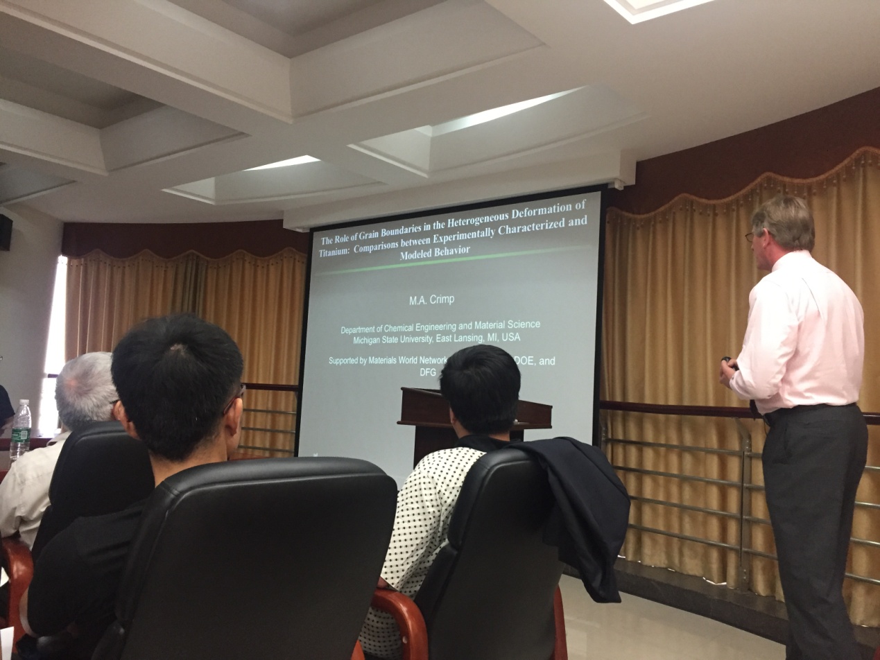本次报告的主题为“The Role of Grain Boundaries in the Heterogeneous Deformation of Titanium and Titanium Alloys: Comparisons between Experimentally Characterized and Modeled Behavior”。Prof. Martin. A. Crimp通过纯钛和钛合金在升温过程中拉伸、弯曲性能的变化,研究该合金的各向异性变形行为。使用SEM、EBSD表征合金在变形前后及变形过程中的微观结构,通过SEM/EBSD痕量分析微区晶粒环境,确定活跃的变形体系。进一步通过AFM分析滑移台阶高度,量化微区塑性变形,表征压痕堆积的本质,以及晶粒边界对压痕堆积的影响。在所选区域内使用3D-XRD表征晶体亚界面和晶轴旋转。在上述实验的基础上,还展开大量晶体塑性有限元模拟计算。教授特别强调了使用电子隧道衬度成像(ECCI)、高分辨选区隧道模式(HR-SACP)技术表征块体材料的晶格缺陷的实验手段。整场报告会生动活泼,师生们进行了热烈讨论,取得了很好的报告效果。