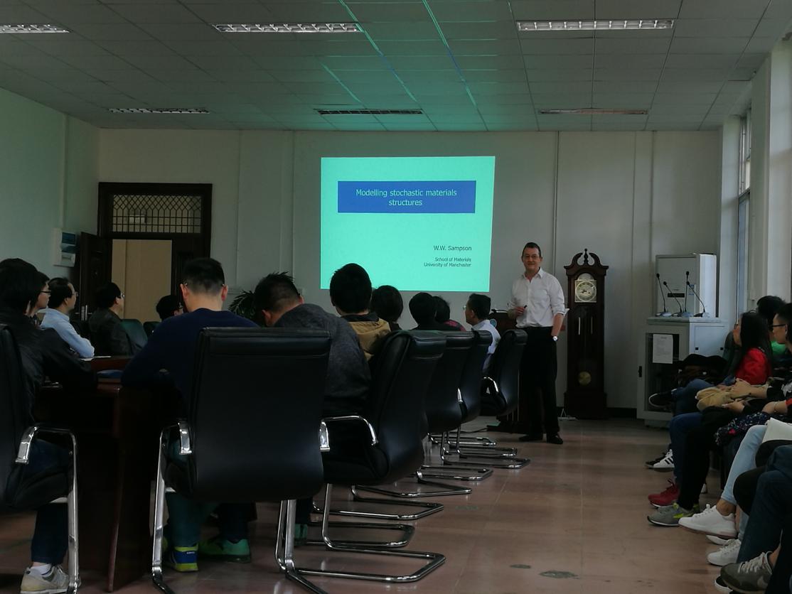 Prof. Sampson首先向大家介绍了英国曼彻斯特大学。作为全球顶尖的科研与教学机构之一,曼彻斯特大学为人类社会的发展做出了举世瞩目的贡献,在国际社会享有极高声誉,其伟德国际1946是欧洲最大的材料工程公司,也是欧洲最大的材料科学、时装与纺织研究和教学中心,在材料学领域的“科研力量”位居全英第一。随后,Prof. Sampson的研究对象为非均匀材料,通过运用科学的方法建立模型来研究结构对材料性质的影响。他向我们讲解了对于不同材料的模型建立,包括纸、非织造织物、复合材料和纤维材料等。整场会议生动活泼,师生们热烈讨论,取得了很好的报告效果。