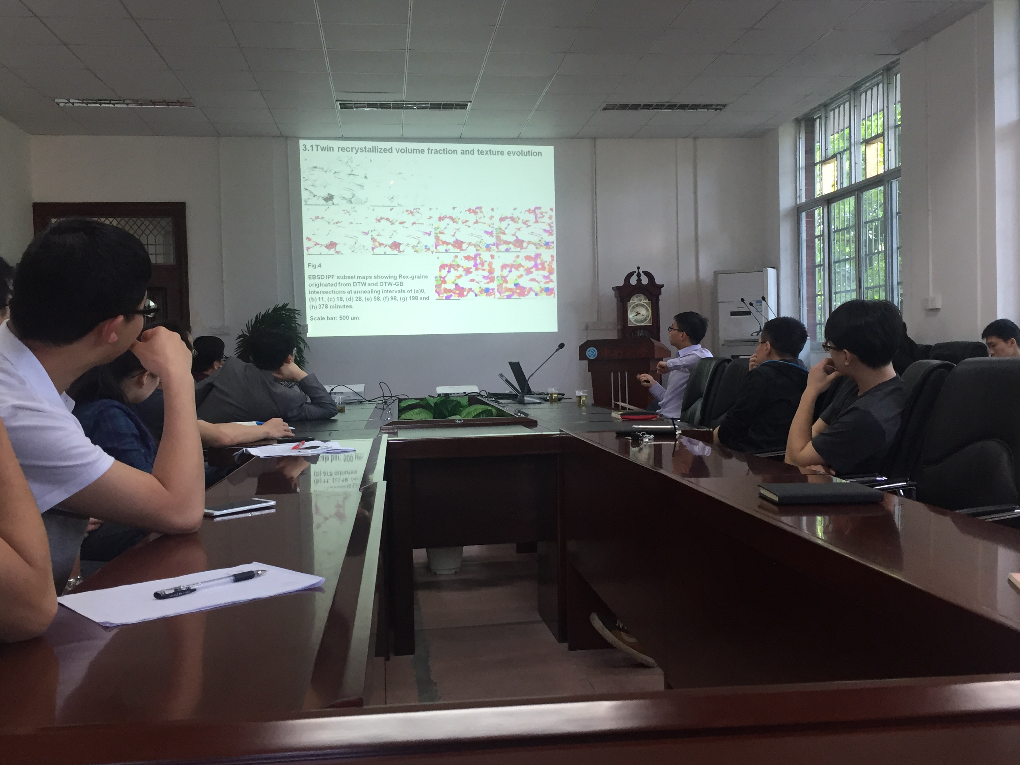 报告会题目为“Twin recrystallization mechanisms and exceptional contribution to texture evolution during annealing in a magnesium alloy ”。官迪凯博士首先谈到,镁合金的成形性和力学性能与结晶基底织构密切相关,变形孪晶在机械加工后广泛形成,再结晶晶粒源自孪晶随机产生,因此削弱了强变形织构。研究内容主要为孪晶的再结晶机理和对再结晶织构的重大影响。这项工作表明,传统研究完全低估了在孪晶内形成的再结晶体积分数。具体而言,来自二次孪晶的再结晶晶粒对织构变化起主要作用,这与过去的几十年的研究报道完全相反。该研究通过首次在整个退火过程中追踪了二次孪晶的优先形核位置、后续晶粒长大和再结晶织构的演变,再结晶机制与各种孪晶类型、孪晶变体、孪晶和孪晶、孪晶和晶界交叉等因素有关。这些发现将会对设计新的变形合金和提高商业合金的成形性带来新的领悟。最后,官迪凯博士总结到此次报告会的目的在于,以镁合金材料为例,向大家展示如何从传统材料领域中找到创新点和新的研究方向,实验手段和方法的设计不应拘泥于一般的实验条件。报告结束后,官迪凯博士与在场师生进行了热切的交流讨论,细心回答了大家提出的问题,报告生动并富有启发性,现场气氛十分活跃。