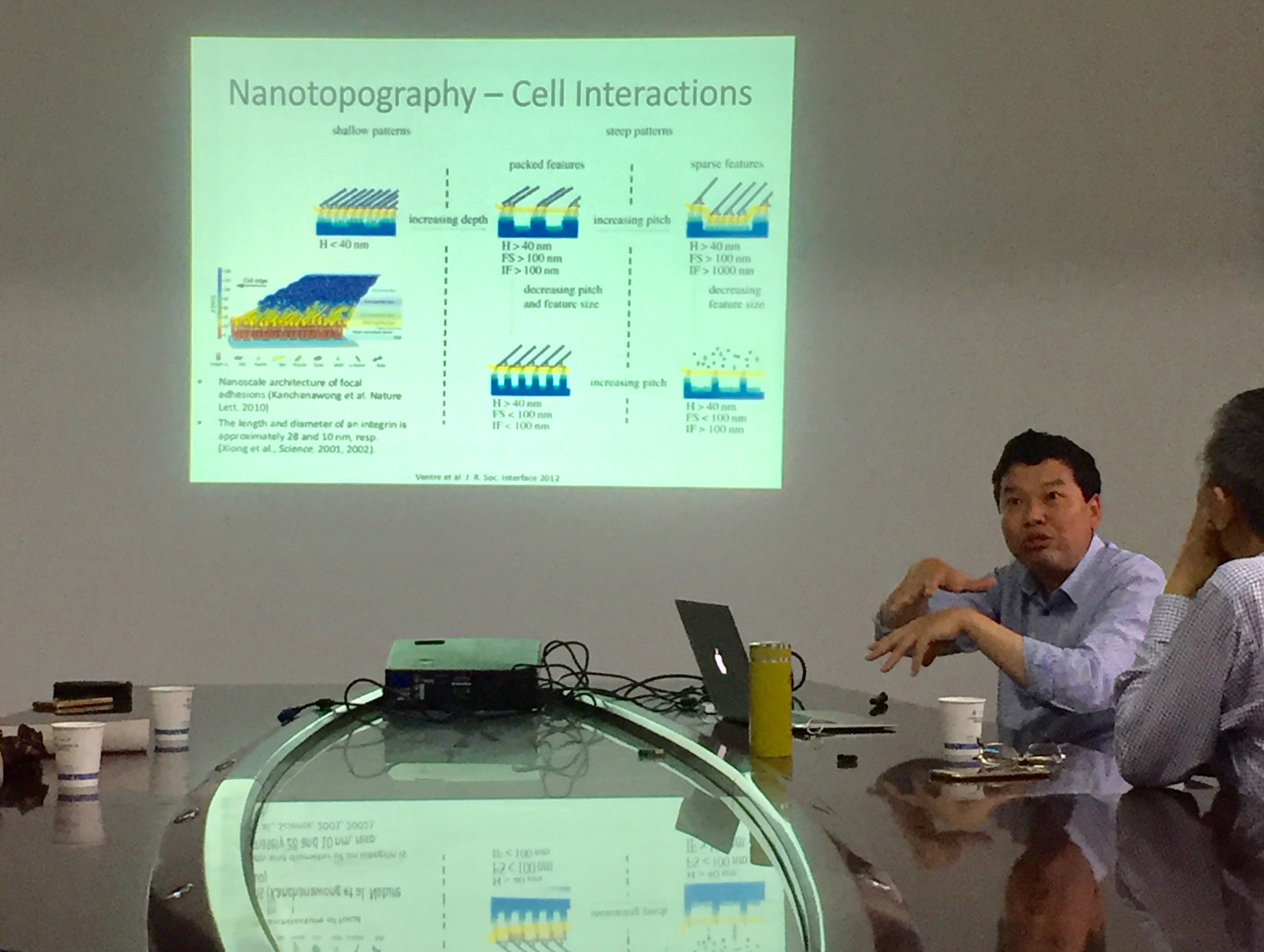报告会题目为“Bio-inspired Antimicrobial Surfaces for Medical Devices and Implants ”。在人口老龄化,肥胖问题增多和抗生素滥用等造成感染几率大大增加的背景下,苏波教授主要针对骨科/牙科植入材料,组织工程骨架材料,骨科/牙科仿生复合材料方面,通过三维表面微米和纳米图案化技术,对钛合金、陶瓷以及聚合物使用于仿生表面抗菌医疗器械和植入物的情况作了详细研究。苏波教授通过研究有效的整合素聚类和接触面积以及细胞和细菌的细胞壁的机械性能,提出突出纳米形貌影响细胞和细菌的粘附、生长和分化,对此,可以有选择地控制不同纳米形貌的细胞可细菌的响应。据此,我们可以通过物理方法设计和制造智能的有益细胞的植入物。报告结束后,苏波教授与在场师生进行了热切的交流讨论,细心回答了大家提出的问题,报告生动并提出了“医工结合”的材料研究新方向,现场气氛十分活跃。