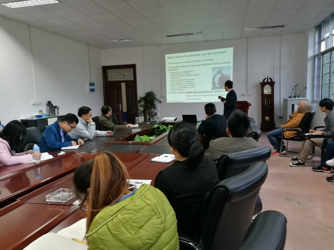 本次报告的题目为“三维原子探针(APT)技术在先进材料研究中的应用”。郭博士首先对橡树岭国家实验室优秀的实验环境做了简要介绍,并向大家展示了APT技术在全世界范围内的应用现状。接着,郭博士给大家讲解了APT技术的工作原理,以及如何制备APT实验样品。然后,郭博士又讲解了APT技术的应用实例,包括晶体非晶体金属奈米结构的观察,对比STEM-EDS技术和APT技术在分析Al-Ni-Co合金相位差上的区别,以及如何研究CdSe/CdTe薄膜半导体装置。最后,郭博士与在场的师生热切讨论了有关APT技术的一些问题,互动过程风味有趣却不失对待科研的严谨态度,达到了很好的效果。