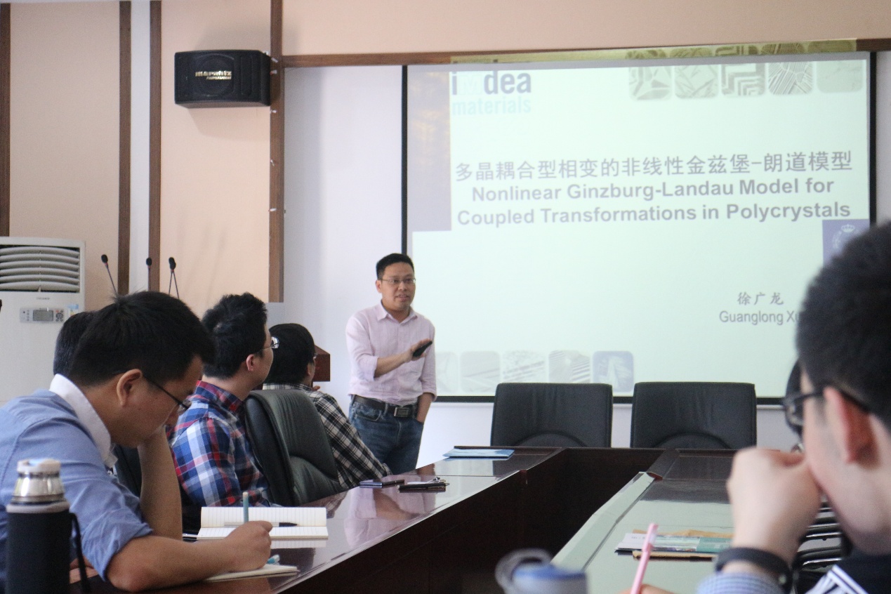 受江勇教授邀请,西班牙马德里先进材料研究所徐广龙博士做了题为“多晶耦合型相变的非线性金兹堡-朗道耦合模型”的学术报告。马氏体相变作为位移型相变的典型,常常和扩散型相变耦合控制着合金中组织的形成和演化,并对力学性质产生重要影响。报告回顾了现有的马氏体相变模型,通过理论分析和模拟计算,分析了现有各种模型的特点和不足。其中,基于不可约化的群表示的朗道模型在物理上具有完备性,但是其在结构材料领域的应用却十分有限。通过和相场模型、计算热动力学以及位错动力学在物理内禀层面的耦合,报告人提出了物理自洽的耦合型朗道相变模型,并应用到合金的组织控制中。通过对形状记忆合金和淬火-配分钢等合金材料的组织演化模拟,耦合相变模型不仅精确描述马氏体组织的形貌特征,重现了实验中观察到的晶界/位错形核,扩散引起的成分再分布等物理冶金现象,揭示了淬火-配分的物理冶金机制,还通过对模拟结果的分析阐明了现有微观组织模型之间的关联,初步建立了多场耦合微观组织演化模拟的框架。