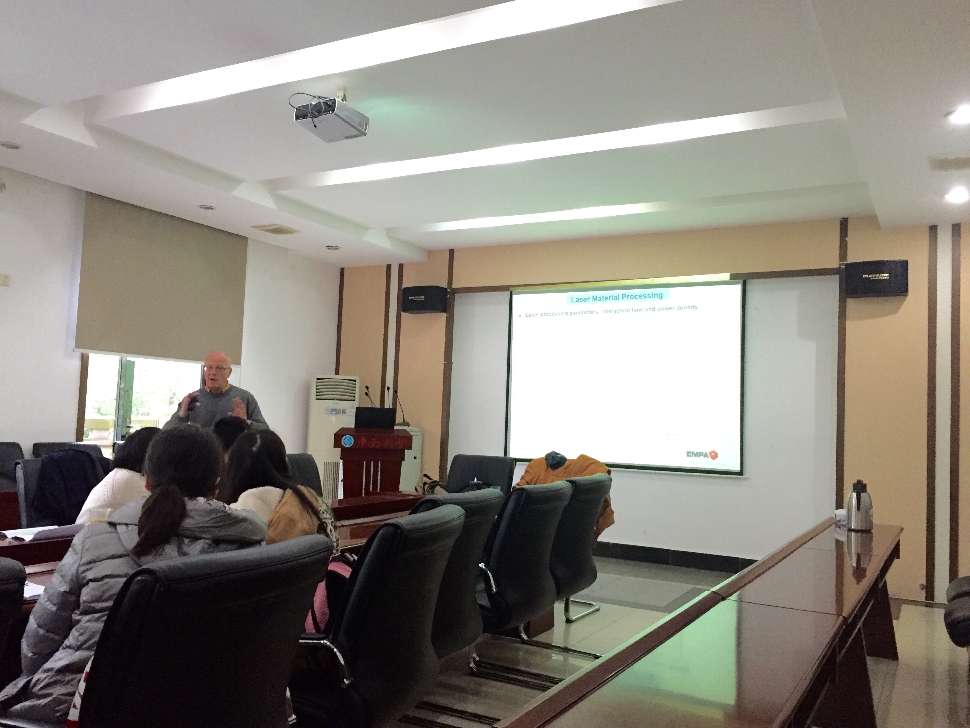 上午9时,受江勇教授邀请,瑞士苏伊士理工公司教授Manfred Roth进行了题为“Laser materials processing. Repair of turbine components”的报告。报告中,Roth教授以发动机涡轮部件的修复为例,对激光材料加工技术进行了介绍。Roth教授从激光加工过程中的物理参量的变化以及材料反应时间的不同切入,分析了激光加工技术的特点及技术优势,报告深入浅出,师生进行了充分的交流。