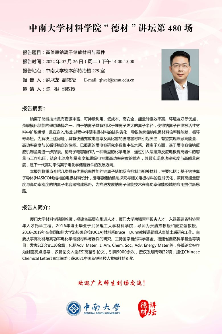 伟德国际1946官网名师名家学术论坛暨伟德国际1946“德材”讲坛第480场——高倍率钠离子储能材料与器件