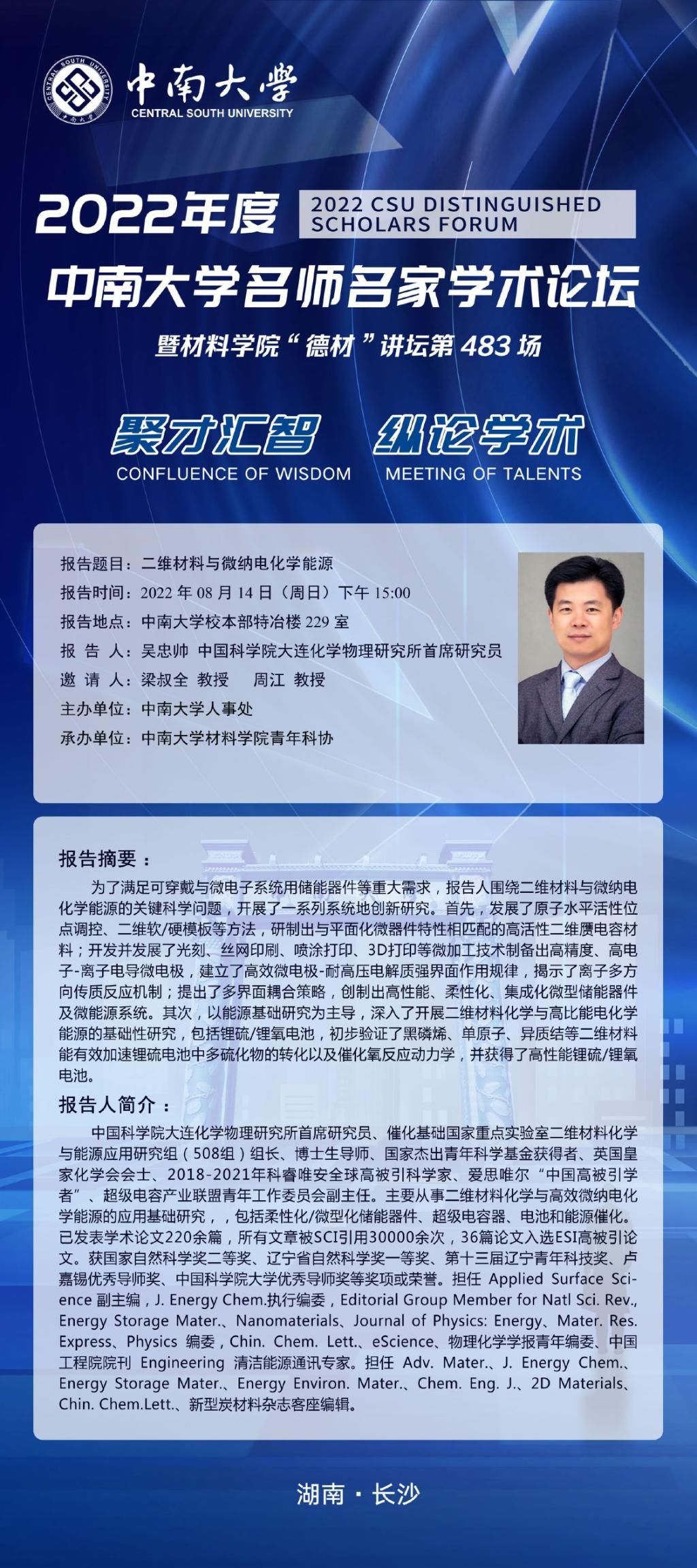 2022年8月14日下午15:00,伟德国际1946官网伟德国际1946青年科协联合伟德国际1946官网伟德国际1946研究生会举办的伟德国际1946官网名师名家学术论坛暨伟德国际1946“德材”讲坛第483场学术讲座于校本部特冶楼229室举行,主讲人为中国科公司大连化学物理研究所首席研究员吴忠帅,邀请人为梁叔全教授与周江教授,多名师生慕名前来参会。