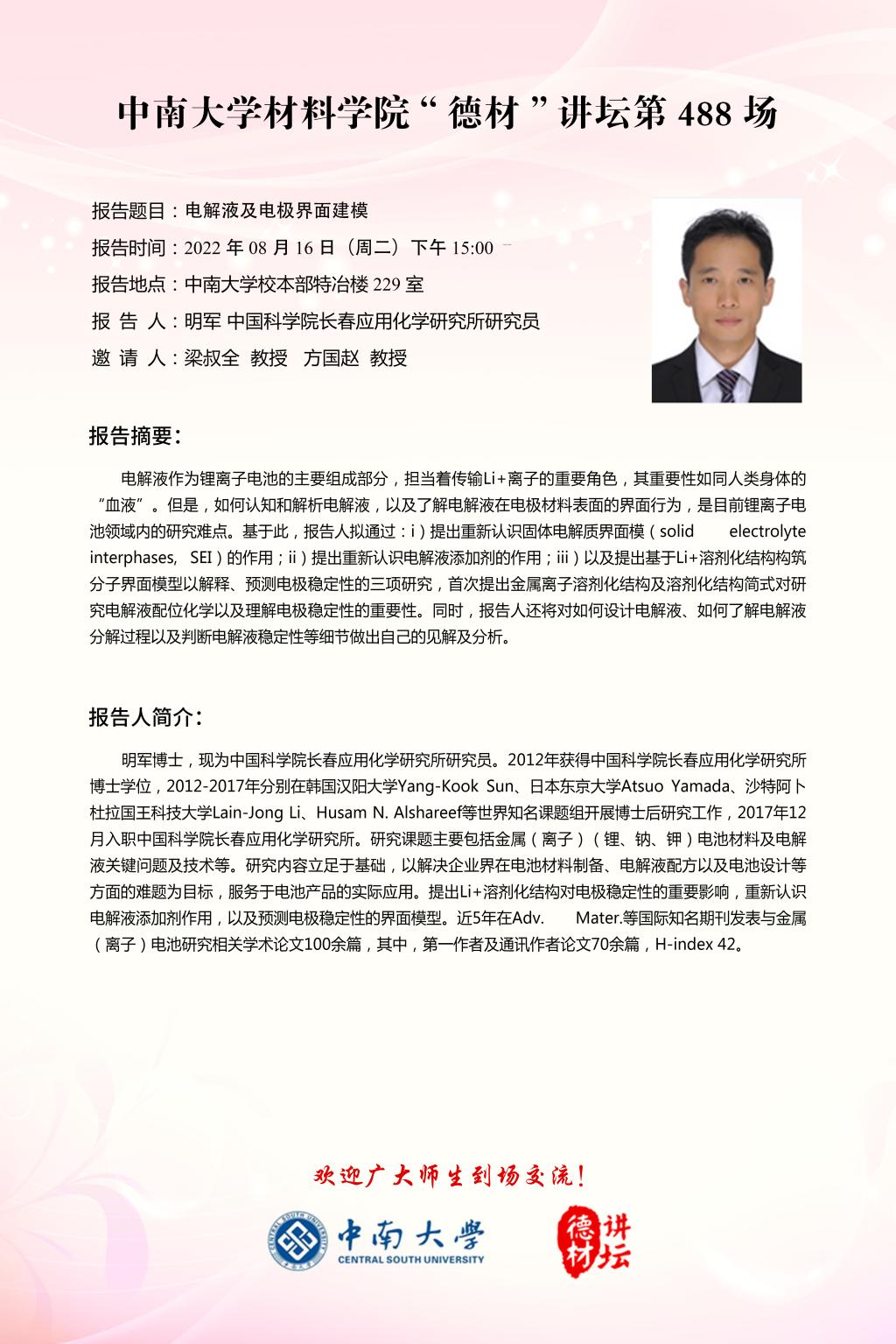 伟德国际1946官网名师名家学术论坛暨伟德国际1946“德材”讲坛第488场——电解液及电极界面建模