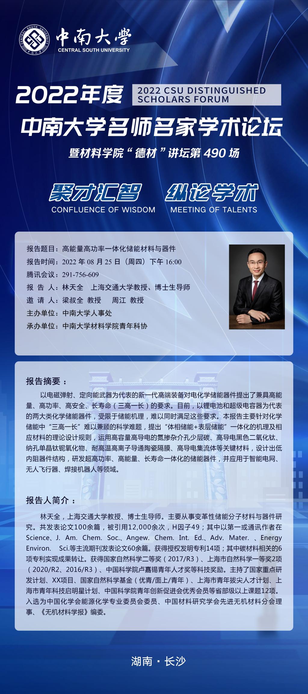 主讲人林天全教授做了题为“高能量高功率一体化储能材料与器件”的报告。在本次报告中,林天全教授从新一代高端装备(电磁弹射、电磁炮等)对电化学储能器件提出了三高一长(高能量、高功率、高安全、长寿命)的要求出发,提出了“体相储能+表层储能”一体化的机理及相应材料的理论设计规则,运用高容量高导电的氮掺杂介孔少层碳、高导电黑色二氧化钛.纳孔单晶钛锯氧化物、耐高温高离子导通陶瓷隔膜、高导电集流体等关键材料,设计出低内阻器件结构,研发超高功率、高能量、长寿命一体化的储能器件,并应用于智能电网、无人飞行器、焊接机器人等领域。