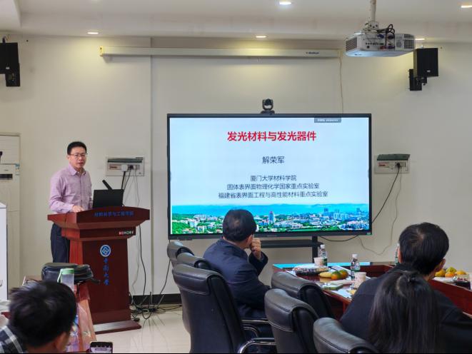 受伟德国际1946蔡格梅、李周教授邀请,解荣军教授就“发光材料及其应用”方面进行了学术报告。在本次报告中,解荣军教授从激光照明(光→光)、新型显示(光→光、电→光)、传感与探测(力→光)三个方面进行讲解;提出高功率密度激发下发光材料面临热猝灭和发光饱和两大挑战;围绕着稀土掺杂氮化物荧光粉和钙钛矿量子点的材料设计、合成和性能优化等方面展开研究,并展示它们在固态照明(LED)和先进显示(LCD、QLED、micro-LED)等发光器件中的应用;针对新一代固态照明的应用需求,将理论应用于激光照明的发光材料的设计和制备(荧光薄膜和荧光陶瓷等),具体包括LYSN-BN复合荧光薄膜的制备与性能改善和LUAG/CASN叠层薄膜(反射式)-用于内窥镜等,表明超宽色域化是显示技术的发展趋势;构筑高性能量子点荧光微球提升光吸收率,赋予它们优异水溶性并有效避免聚集荧光猝灭;在构建新型应力发光材料的基础上,展示它们在传感和探测等方面的新应用,如通过在应力发光材料中引入深陷阱用以储存电荷。同时,解荣军教授还对如何将发光材料应用到照明、显示、生物医学、传感和探测进行了分享。