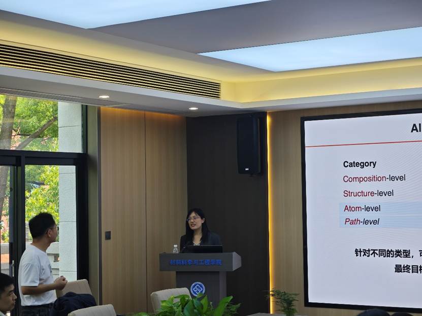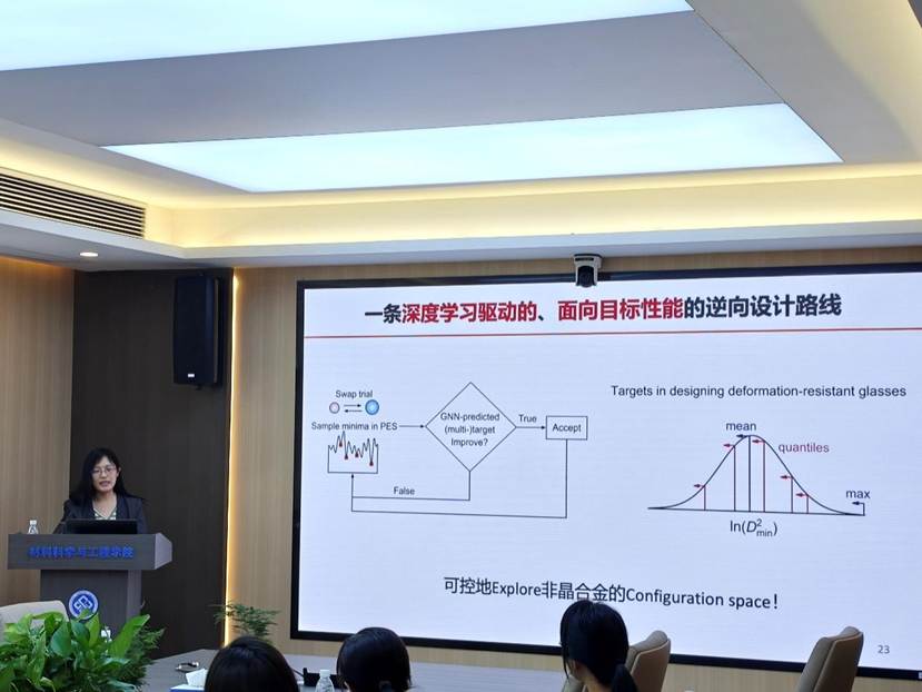 在本次报告中,王琦副研究员聚焦非晶领域备受关注的核心问题——“对无序而言,是否绝对无序?无序中是否存在有序?”展开深入探讨,她以这一问题为切入点,逐步引入无序合金成分、结构与性能之间的关联性研究,进而提出借助大数据与人工智能融合的创新方案,旨在突破传统研究瓶颈,推动该领域的发展。王琦副研究员还详细介绍了机器学习的基本概念及其在材料研究中的典型应用流程。基于深度图神经网络技术,研究团队成功实现了“end-to-end”预测,能够精准预测每个原子的塑性变形倾向性,为非晶无序结构的逆向设计提供了有力工具,通过逆向设计,成功实现了Cu-Zr非晶合金塑性变形抗力的可控提升,为非晶合金的实际应用拓展了新的可能性;此外,研究团队还深入探讨了熔体中原子层面的弛豫不均匀性及其结构起源,借助相关模型的解释,揭示了机器学习在预测和决策过程中的内在依据,使研究结果更具科学性和可解释性;同时,通过机器学习技术,研究团队发现了非晶原子存在链状运动现象,并进一步揭示了链状运动的路径依赖性,基于此,能够预测某个路径是否倾向于参与链状运动,从而深入探究链状运动的结构起源,为理解非晶合金的微观机制提供了新的视角。