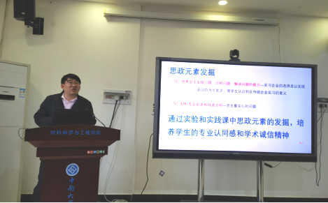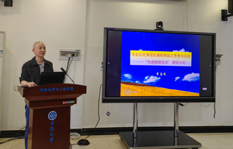 材料化学系主任李志成教授以《专业实验课程的课程思政之思考与实践—“先进陶瓷实验”课程》为例,详细分享了在专业实验课中如何润物无声地融入思政元素。如通过实验分组,发挥各自的优势、凝聚集体的力量,达到1+1>2 效果,培养合作意识;通过实验报告的规范性,拓展到做事做人的“规范”。