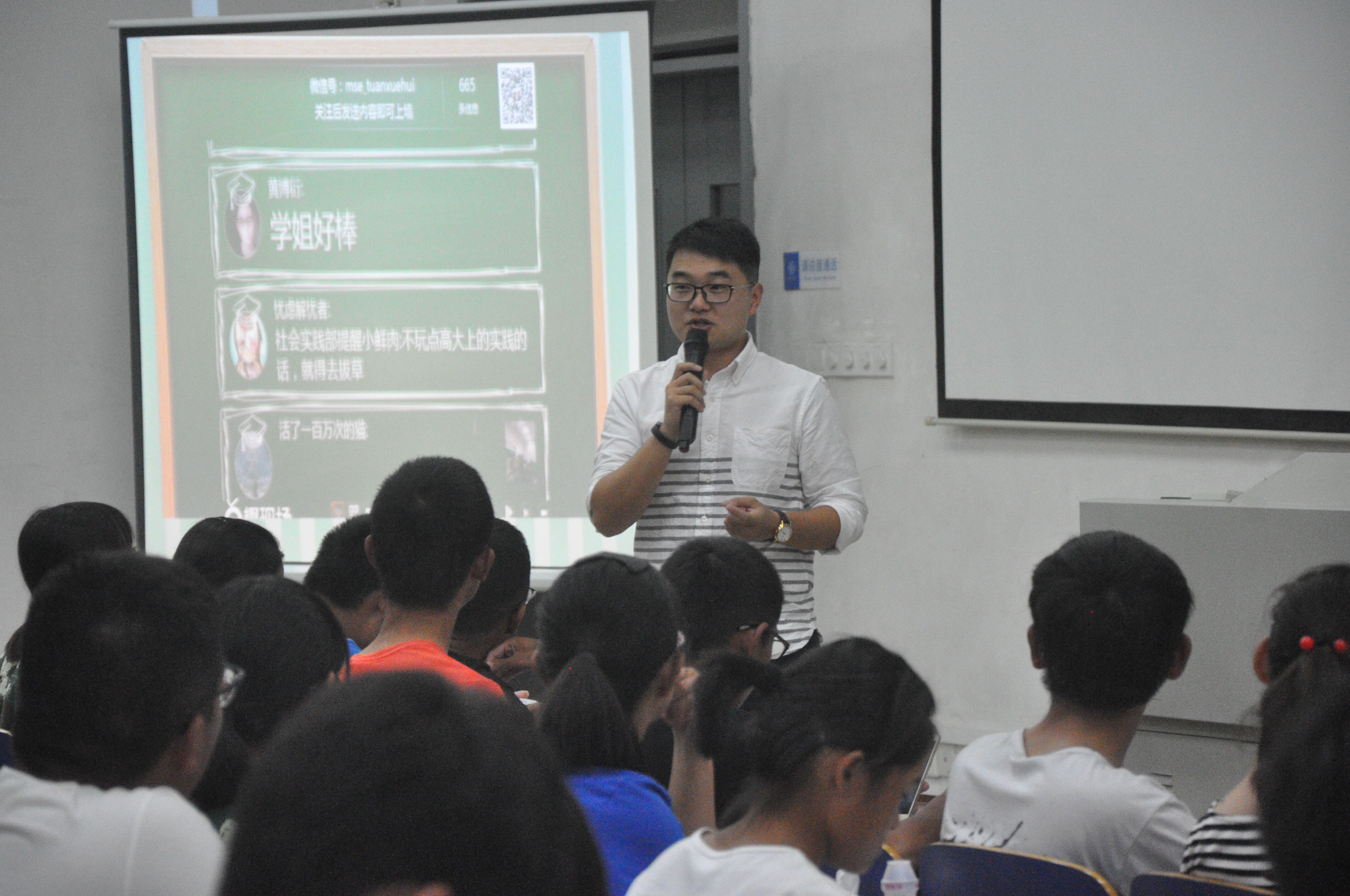 公司16级辅导员彭需发老师首先指出了材料院团委员工会的重要性,并积极号召大家加入团委员工会,锻炼自己。紧接着,主席孙玮琛向大家简要的介绍了团学会“团结、务实、创新、争一流”的工作宗旨,“规范化,基地化,网络化,项目化”的工作思路。随后,青年志愿者协会,学习部等十三个部门的部长或副部长依次上台,以演示文稿的形式,生动地为新生们介绍了相应部门的职能,重要性和招干要求。最后,部长们对新生们提出的相应问题进行答疑,留下了联系方式并发放纸质报名表。