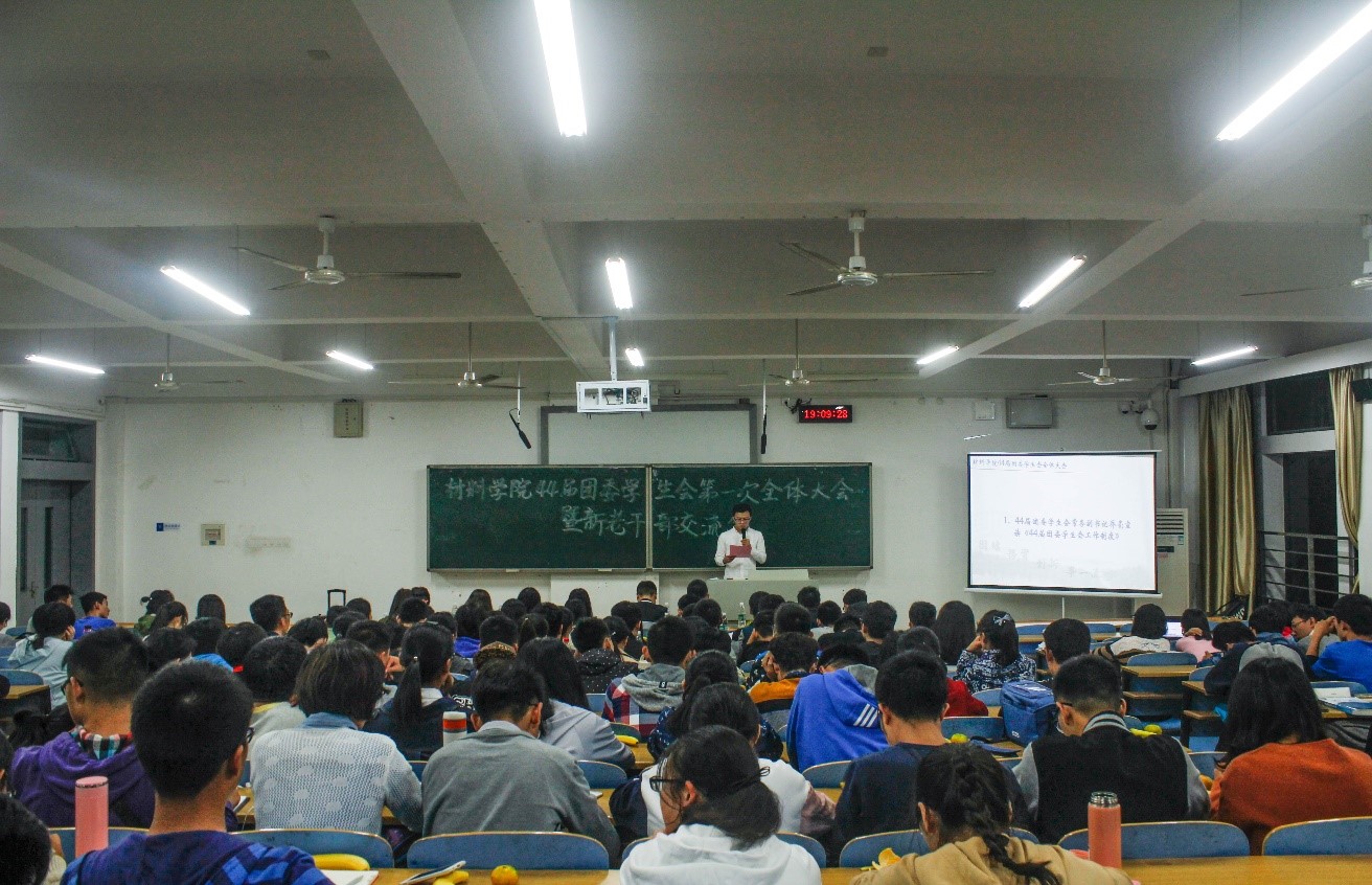 大会伊始,团学会副书记乔亮宣读《44届团委员工会工作制度》,强调遵守规矩的重要性。随后,团学会主席孙玮琛讲述了对工作和学习的认识并表达了对团学会的期待,并希望在工作上各部门成员能够贯彻“团结·务实·创新·争一流”的会训,学会取舍,以学业为重。