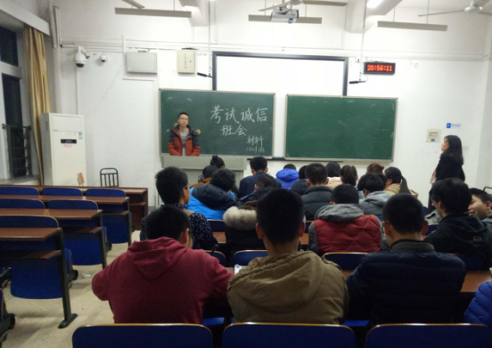 会议伊始,吴子文班长就直奔主题,从多个方面列举考试诚信的重要性。他说道,无论是从法律还是道德的层面上说,考试违纪作弊都是不对的,这不仅是对他人的不公平,还是对自己的欺骗。一旦作弊成功,人便会存有侥幸心理,最终自尝恶果。同时,他还对我们的期末考成绩寄予了期望,他相信我们将会遵守考场规则,诚信考试,实现全班零挂科。