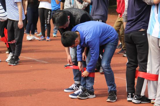 绿草如茵,春光正好。上午8:30,三个班级的同学在南校区田径场集合。初次见面,同学之间较为陌生。为活跃气氛,三个班级随机分组,一起进行“贴烧饼”游戏。互相追逐,欢声笑语,同学们很快打成一片。