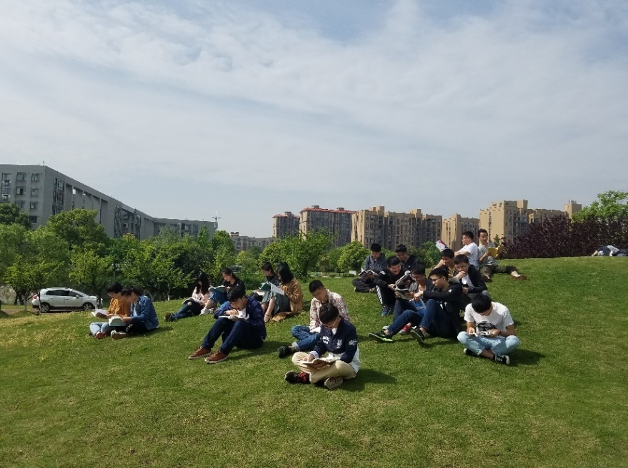 18日8:00,晨读活动于新校区d座旁草地上进行。或朗诵一首诗歌,或练习英语口语,或吟唱一曲民谣,丽日和风中的才子才女展现青春风采,张扬青春活力。