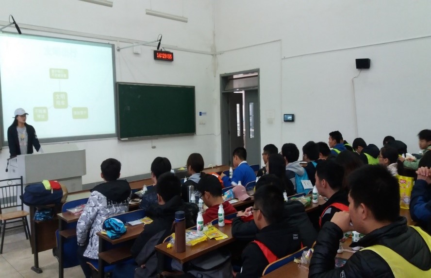 活动伊始,两位团支书安排了两个班同学交错坐在一起,促进了新老生之间的交流,帮助新生更好地了解大二大三学习生活的安排,以及对自己未来道路选择的评判。交流之中,学弟学妹主动提问,学姐学长热情解答,气氛十分温馨。然后主持人对现在大公司园交通情况特别是共享单车的使用现状作了简单的介绍和评价,指出如今不文明出行的行为,并告诫同学们在出行中需要做到文明礼让、遵守规则。最后,活动还设置了诸多娱乐环节如抢答、你画我猜等,让同学们在欢声笑语中对文明出行这一概念有了更深刻的认识和理解,并使之铭记于心。