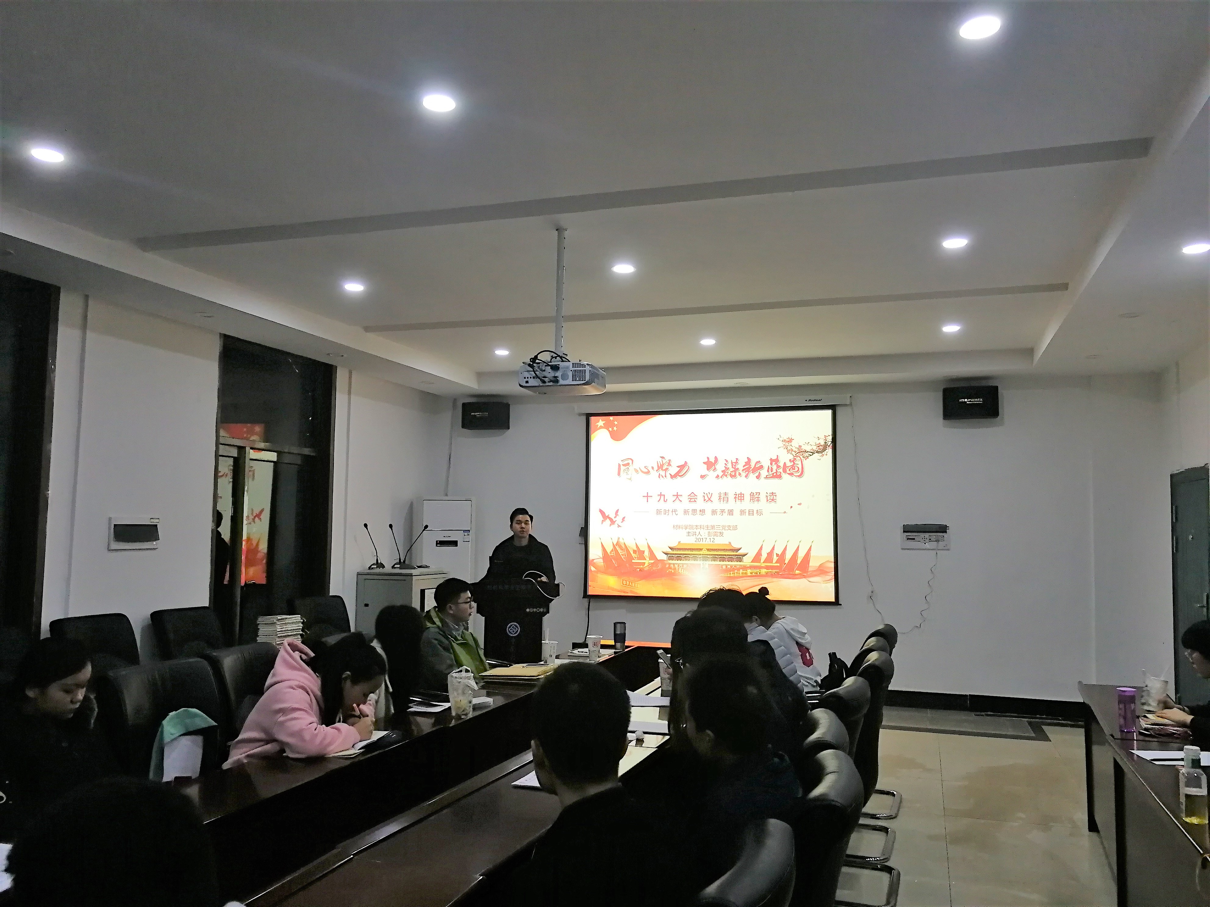 彭需发书记在此次全体大会上就十九大会议精神进行解读,为全体党员上了一堂紧跟时代发展的党课。彭书记从新时代、新矛盾、新目标三个方面介绍了我党建设的总要求和新思路,感叹十八大以来我党取得的成就和为人民生活带来的巨大发展变化,呼吁各位党员结合国家发展的大政方针,做合格党员、对国家有用之才。各位党员纷纷发言,阐述对十九大会议精神的理解与体会,开展批评与自我批评,并进行深入交流。会议气氛严肃且活泼。