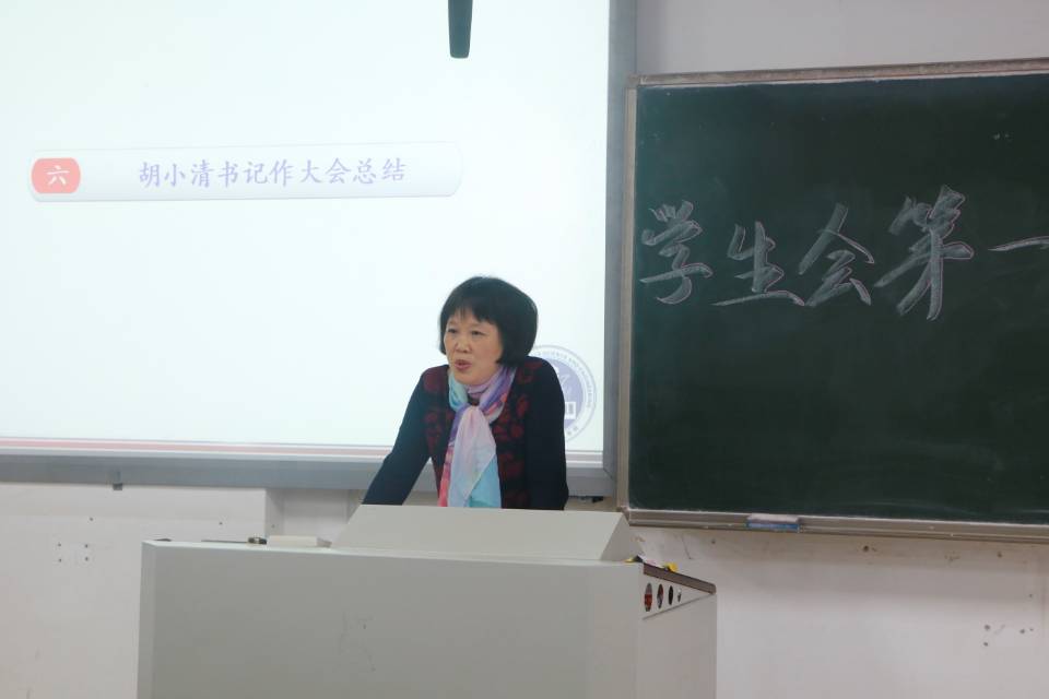 胡小清书记对本次会议做出总结。她祝贺同学们当选为团学会干部,表示作为员工工作骨干,应担当责任,在工作中有所收获。她希望本届团委员工会能在优秀活动与习惯传承发扬的基础上,学会创新,上下求索,并预祝本届团学会能够取得更好的成绩。