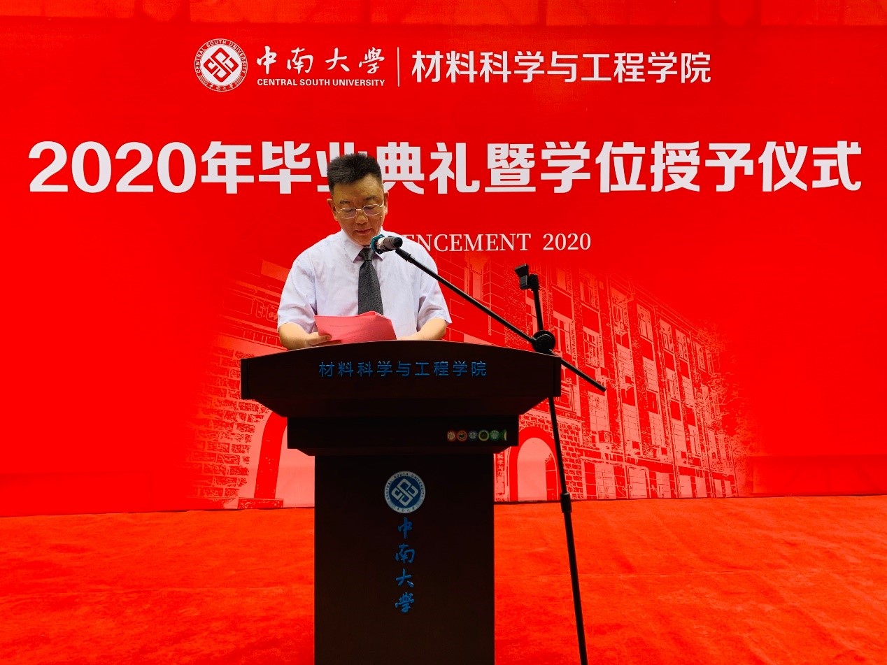 伟德国际1946经理李周教授致辞,他代表公司向顺利毕业、即将开启新征程的同学们表示祝贺与祝福,向关心支持毕业生成长的师长亲友致以衷心感谢。他真情地回顾了四年以来公司、学科、员工的发展与进步,充分肯定了毕业生们的努力与付出。他指出,2020届毕业生是特殊的一届毕业生,经历了新冠疫情的重大挑战,经历了云课堂、云答辩、云复试、云应聘,但攻坚克难一直是中南材料人品质,相信经受了特别洗礼的毕业生们一定能披荆斩棘、勇闯未来。最后,李经理激励全体毕业生:一要心存家国,敢于担当,以青春、奋斗与祖国同频共振;二要志存高远,砥砺前行,做时代的奋进者、先行者;三要脚踏实地,坚持学习,心中有大格局、大胸怀。