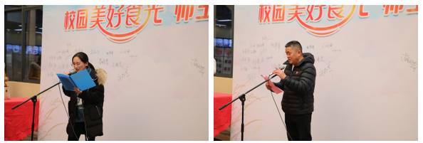 11:30分,活动仪式正式开始。在校领导的监督下,伟德国际1946员工党员代表、后勤党员代表分别宣读承诺书。伟德国际1946本科生第三党支部员工党员代表王姝雯同志在承诺书中重点强调了粮食安全的重要性,通过自己在大学中担任班长,获得“壹号食品”奖学金,呼吁全体同学谨记“厚德、善学、乐业、成器“的院训,把厚德放在首位,坚持热爱劳动、勤俭节约,积极养成珍惜粮食、厉行节约、反对浪费的良好习惯,做节约粮食的践行者,示范者和传播者。后勤员工代表表示,日后会进一步加强配餐管理,按需按量为同学们配餐,做到光盘不浪费。两份承诺书满载着员工及后勤员工们对于传承发扬节约美德、反对铺张浪费的决心与信心。