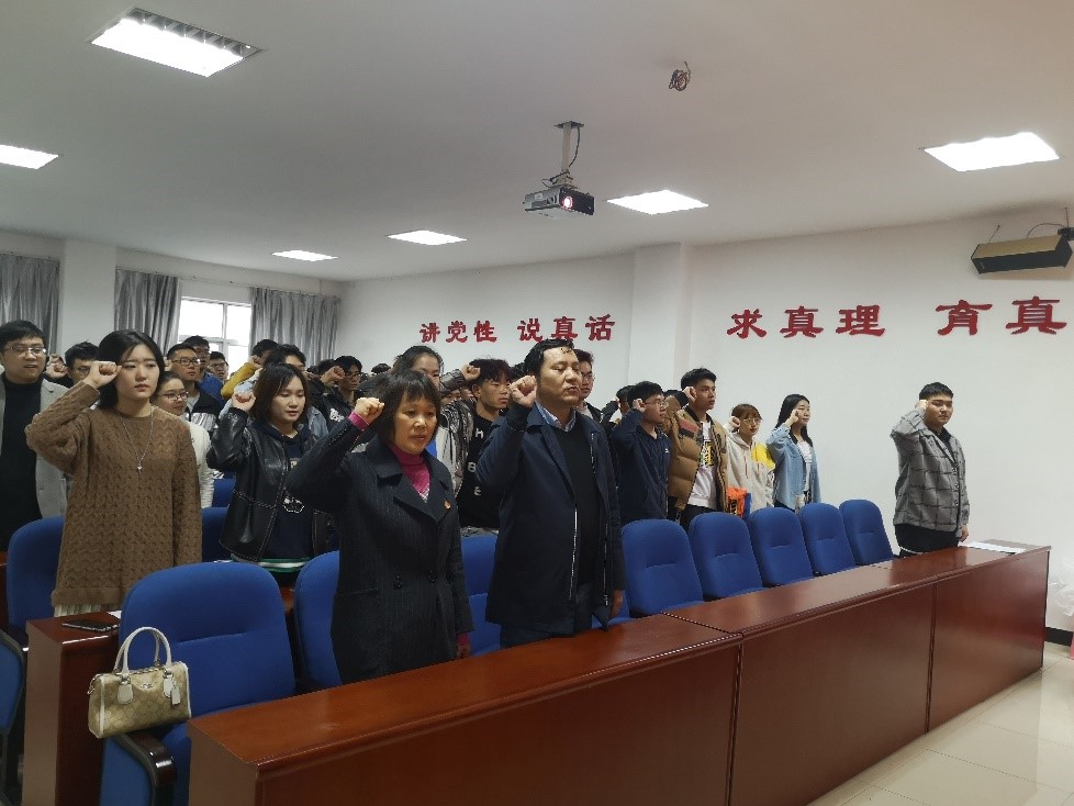 名单宣读完毕后由王德志书记带领全体预备党员集体宣誓,在场所有同志面向党旗,高举右拳,郑重宣誓,许下为共产主义奋斗终身、随时准备为党和人民牺牲一切的誓言。