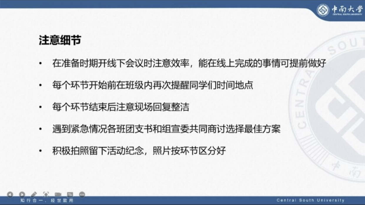 在公司团委书记致开场词后,会议正式开始。首先,校团委组织部活动管理中心进行了团日活动经验分享。校团委组织部从团日活动的活动前期的构想策划、真正的组织开展、结果的收集整理以及优秀团日活动与总结的评定标准对同学们进行了详细的介绍。贴合活动主题、充满乐趣、富有意义的每一个团日活动,都将是四年不可磨灭的共同回忆。