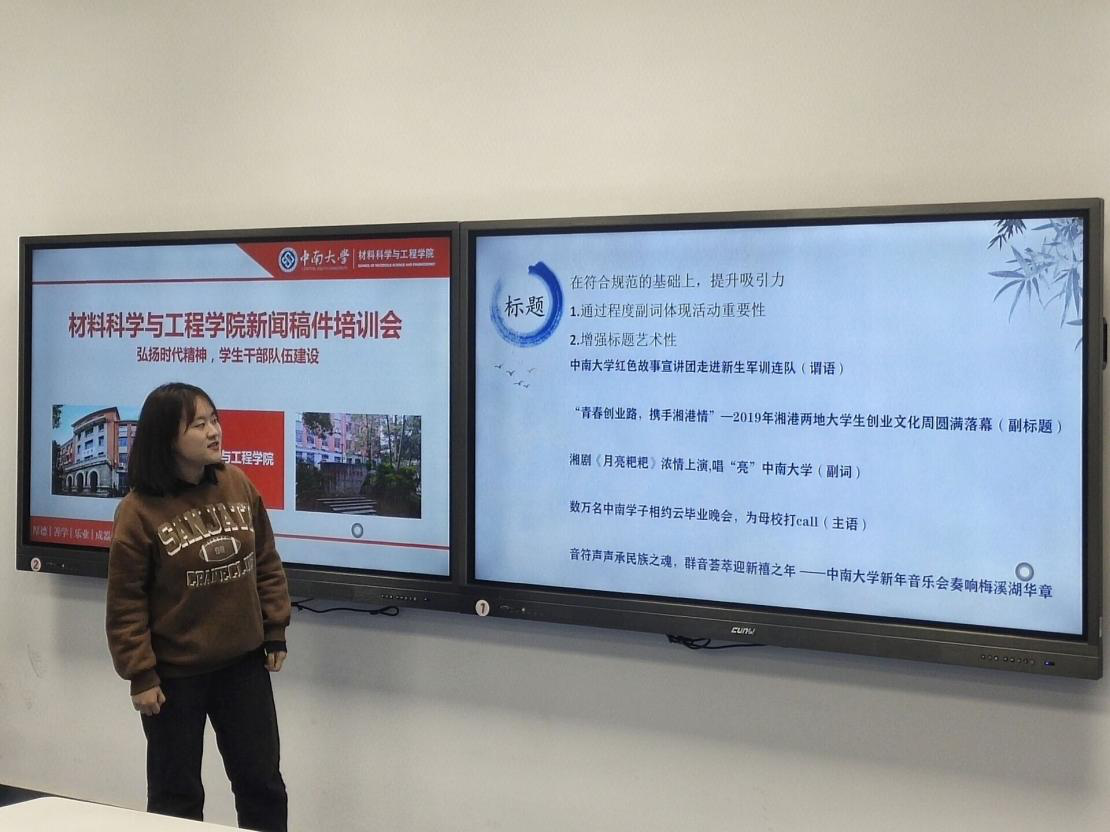 讲座第一部分,由校团委宣传部新闻编辑部金圣喜同学进行新闻稿件写作的经验分享。她介绍了各种新闻稿件的格式、区别,并就如何撰写新闻稿以及撰写时常出现的错误进行了深刻地讲解与分析。