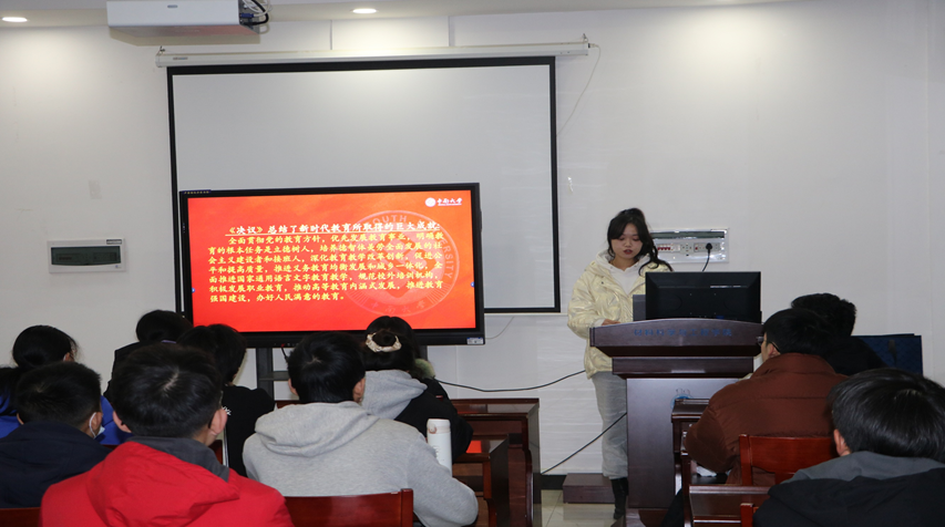本次宣讲会内容与十九届六中全会所提出的要求高度契合,刘若辰同学就会议教育方面内容给同学们进行了具体的剖析,提出了公司发展的关键命题,介绍了新时代大学转型的方向,明确了高校改革的主体方案,发出为教育做出贡献的号召。