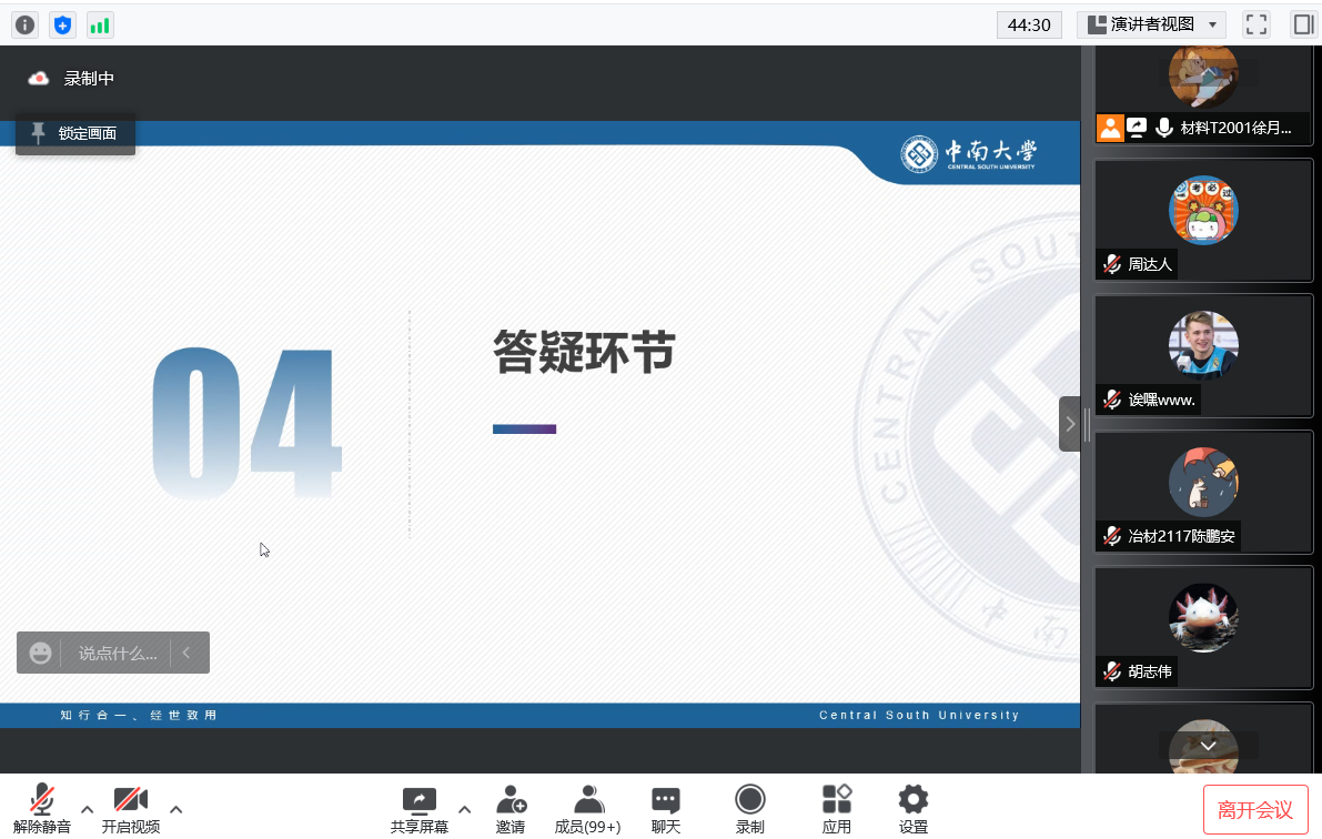 随后,朱正午队长结合自身经历分享了党史宣讲实践经验。他提出选题要关注社会热点,最好结合长期调研,设立阶段性目标;同时应合理安排团队任务,充分发挥每一个队员的优势。社会实践过程的每一步要走稳、走实,后期的宣传工作也必不可少。
