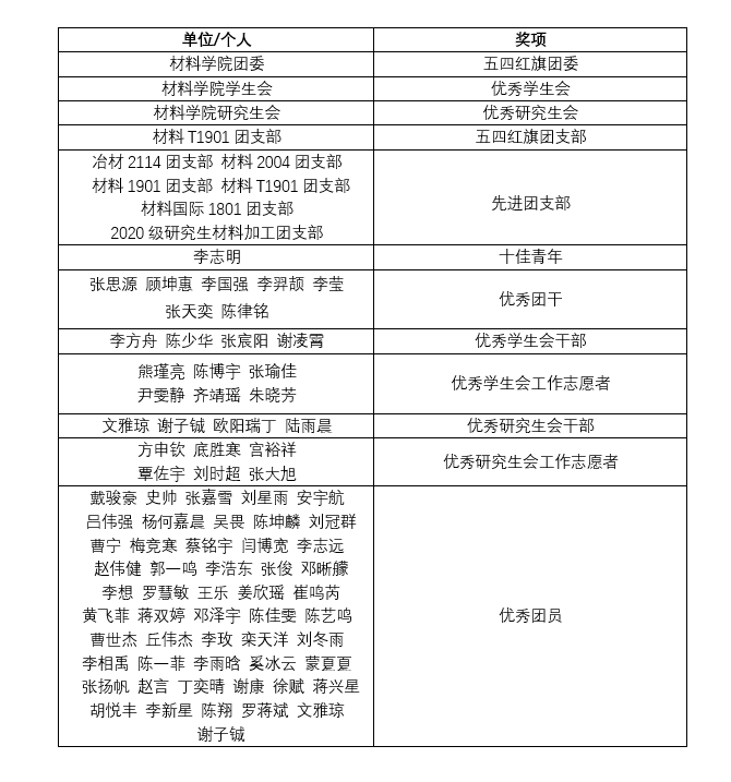 在刚刚过去的五四评优工作中,伟德国际1946取得优异成绩:公司团委获评五四红旗团委,公司员工会、研究生会分别获评优秀员工会、优秀研究生会;材料T1901团支部获评五四红旗团支部,冶材2114团支部等5个本研团支部获评先进团支部;材料学系李志明教授获评十佳青年;张思源等7名同学获评优秀团干,李方舟等4名同学获评优秀员工会干部,朱晓芳等6名同学获评优秀员工会工作志愿者,谢子铖等4名同学获评优秀研究生会干部,宫裕祥等6名同学获评优秀研究生会工作志愿者,戴骏豪等52名同学获评优秀团员。