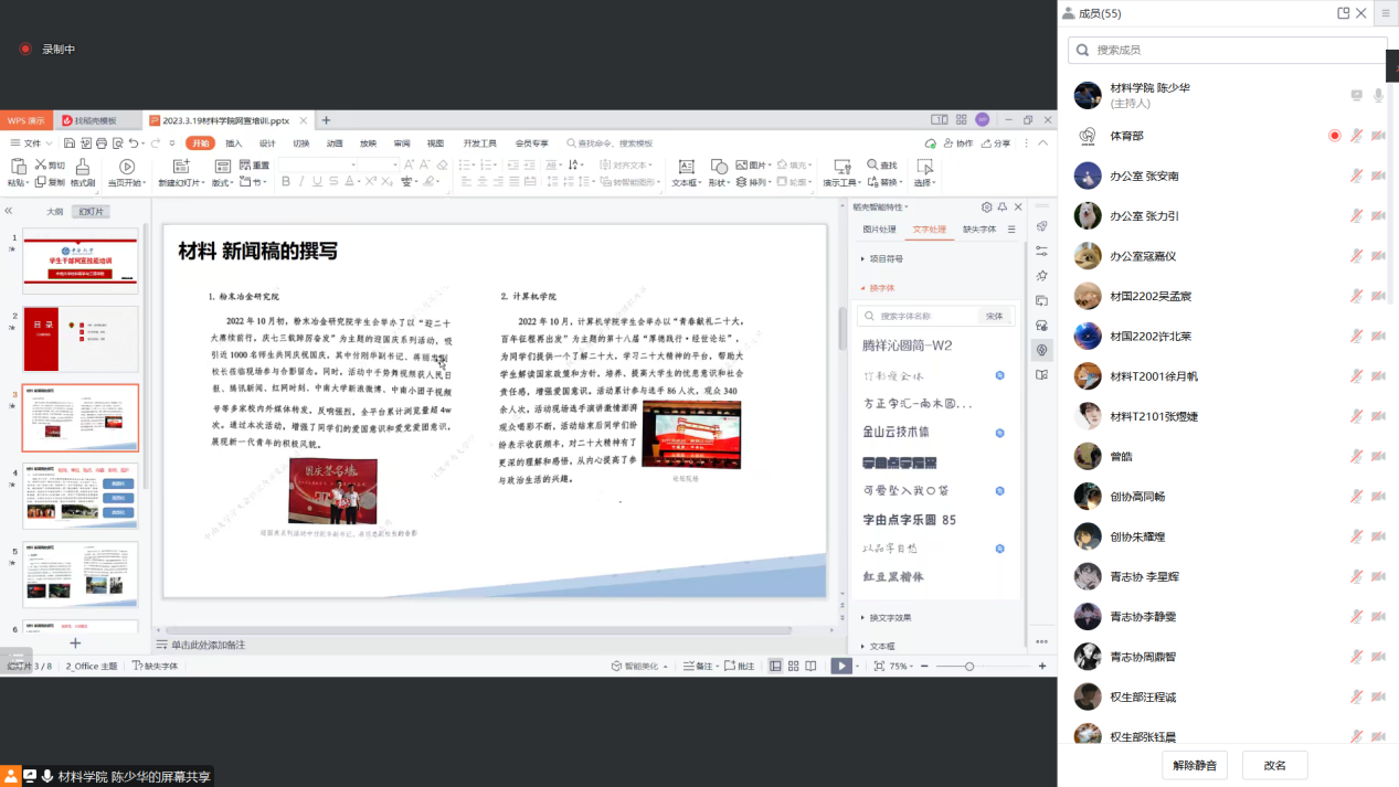 会上,陈少华对材料与稿件的撰写做出了分析,强调在撰写稿件时应数据化、规范化、典型化,做到准确地对相关会议、活动进行报道。同时他还强调在活动的举办上要尽量广泛化、创新化,将活动与实际相联系,脚踏实地,牢记以服务广大同学为宗旨。