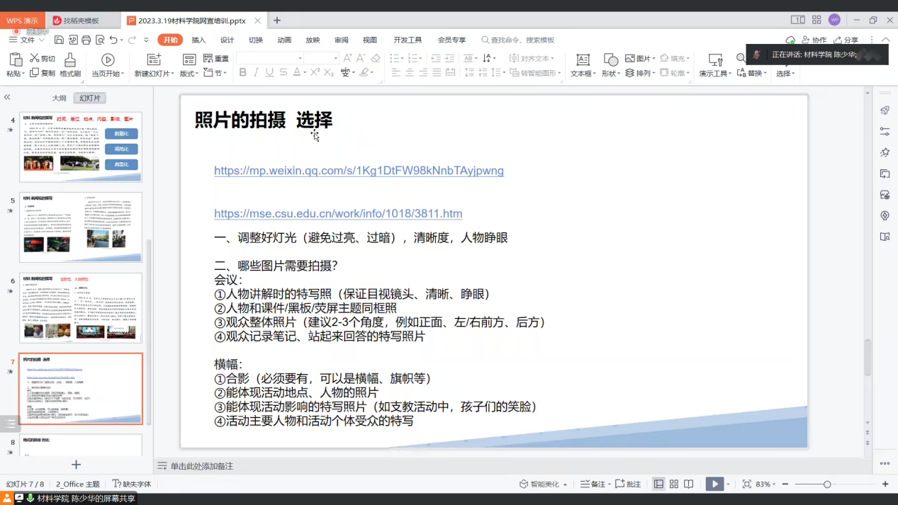 随后,陈少华对照片的拍摄技术与筛选方法提出了改进意见,即:调整好灯光、清晰度,保证人物目视镜头、高清晰高质量、突出活动、会议重点,多角度体现活动主题、受众等。他强调图片是稿件的重中之重,一定要合理构图,让读者有更加良好的阅读体验和观感,也使稿件更加严谨化、规范化。