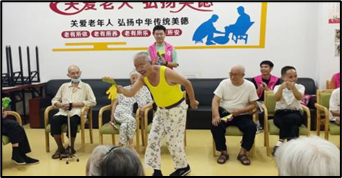 首先,实践团成员用一首经典老歌《外婆的澎湖湾》为活动奠定了欢快的基调。经社工部负责人介绍,在场的老人们大多是退休的文工团干部、老党员,对经典红歌有深切的情怀。于是,成员们歌唱了《没有共产党就没有新中国》、《歌唱祖国》……期间,在成员们热情的互动下,爷爷奶奶们也不复最初的拘紧,开始伴着音乐小声哼唱,挥舞起手中的鼓掌拍手器。随着越来越多的老人加入,歌声也一阵高过一阵,最后赫然有了演唱会现场的既视感。在那一张张洋溢着笑容的脸上,透过深刻的皱纹,成员们看见的是无限的活力和对生活的热爱。接着活动进入高潮,来自内蒙古的魏帅杰和来自浙江的程俊斌上台介绍自己的家乡并表演了才艺。热烈的气氛深深地感染着每一个人,在大家的鼓动下中,“身怀绝技”的爷爷奶奶们也终于按捺不住内心的激情,献上了精彩的表演,为上午的活动画上圆满的句号。