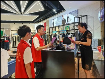(图为成员给商户讲解图片)