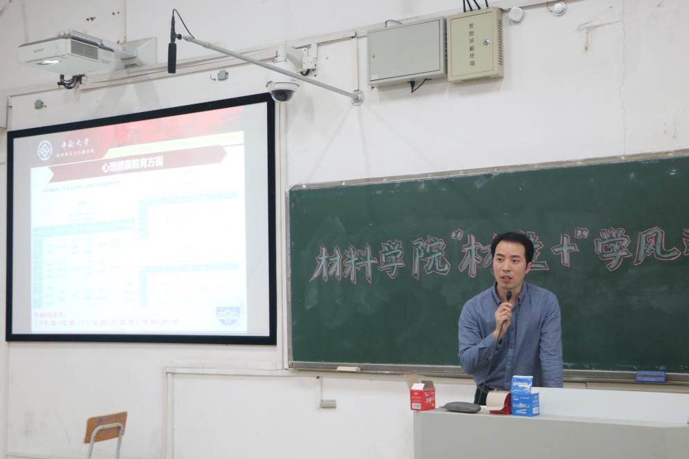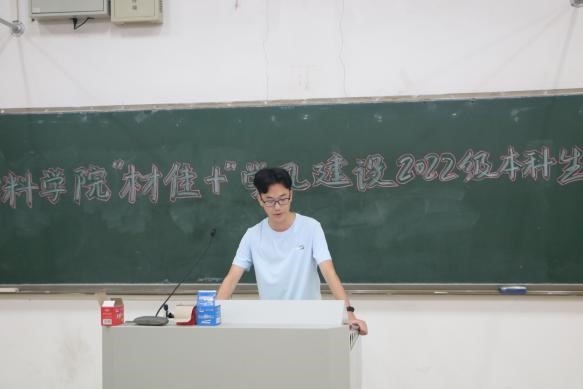 会议第二项,蔡圳阳老师重点阐述员工日常工作管理与老员工涯规划两方面。蔡老师首先着重讲到日常工作管理中的安全工作,包括交通安全、财产安全、实验室安全等,提高了同学们的安全意识。其次,从成绩规划、员工工作、志愿实践、竞赛科研、出国留学等方面为同学们进行详细讲解,为材料院的学子们指明了方向。