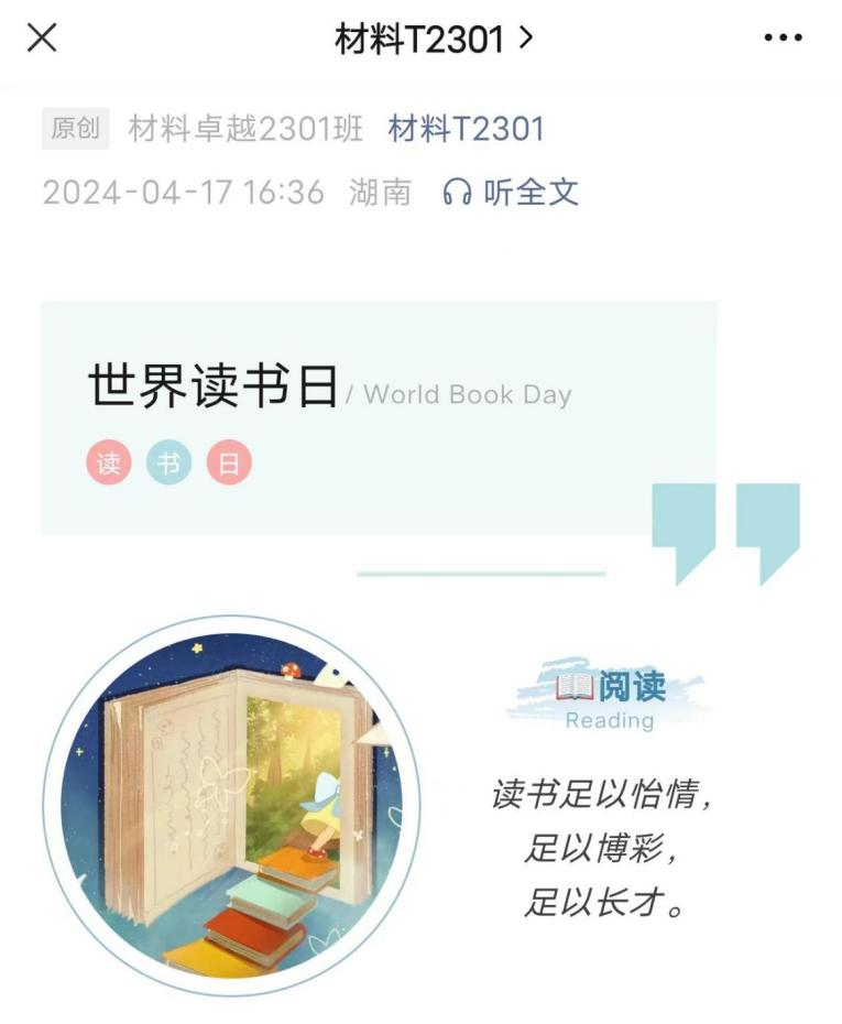 随着4月23日的世界读书日临近,材料卓越2301班始终把优秀作为坚持,培养终身学习的习惯。班级同学们希望本次读书月活动,让大家在忙碌的生活中找到片刻的宁静,在纷繁的世界中找到清晰的方向,让阅读成为生活的一部分。