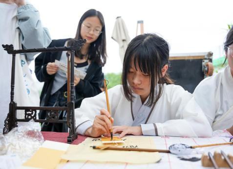 在先秦汉廊亭,同学们挥瀚写福祝端阳,欣赏书法,现场进行团扇书写临摹体验、端午书签明信片体验等。